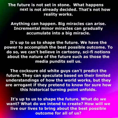 But wait! There are key caveats to everything I just said. Here's what the fearmongers and doom-peddlers don't want us to understand: This isn't the end of the world. It's the beginning of a new one. And we are not victims of this transformation—we are co-creators.