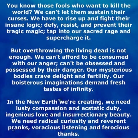 The old world is dying, and the new one is struggling to be born. We're not just watching this process; we are midwives. So we don’t need to wait for permission to be revolutionary. We can shed any belief we might have that someone else is going to save the world.
